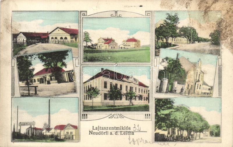 Lajtaszentmiklós, Neudörfl an der Leitha; Gasthaus Schachinger, Bahnhof, Staatsvolkschule, Sigismund Lendvay's Borstenfabrik. Verlag Buchdruckerei Schön / utcakép, vasútállomás, állami népiskola, Lendvay Zsigmond sörtegyára, üzlet / street view, railway station, bristle factory, shop. Art Nouveau (felületi sérülés / surface damage)
