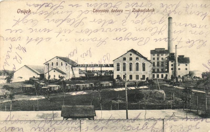 Eszék, Osijek, Esseg; Tvornica secera / Zuckerfabrik / Cukorgyár, ipar... https://www.darabanth.com/de/309-Fernauktion/309.0/Ansichtskarten/Kroatien~300010/Eszek-Osijek-Esseg-Tvornica-secera-Zuckerfabrik-Cukorgyar-iparvasut-vagonok-Selzer-es-~II1685292
