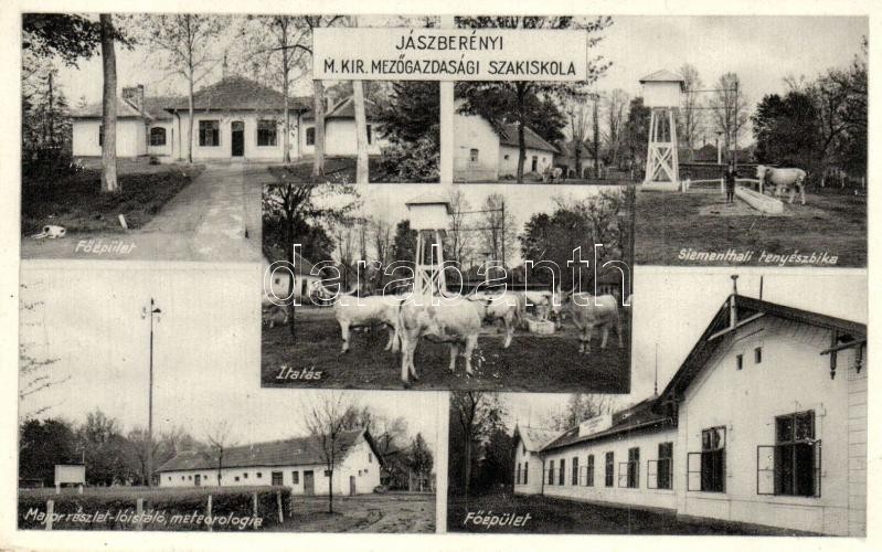 Jászberény, M. kir. Mezőgazdasági Szakiskola, Főépület, Siementhali tenyészpika, Major részlet, lóistálló, meteorológiai állomás. Novotha Andor kiadása (EB)
