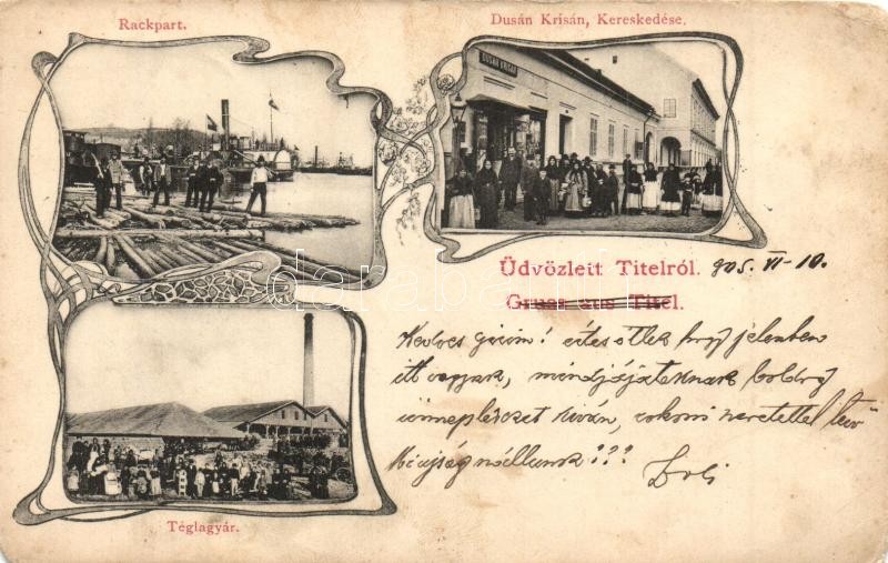 Titel, Gőzhajó állomás, rakpart, Szondi gőzös, Téglagyár, Dusán Krisán üzlete / steamship station, wharf, quay, brick factory, shop. floral Art Nouveau (kopott sarkak / worn corners)