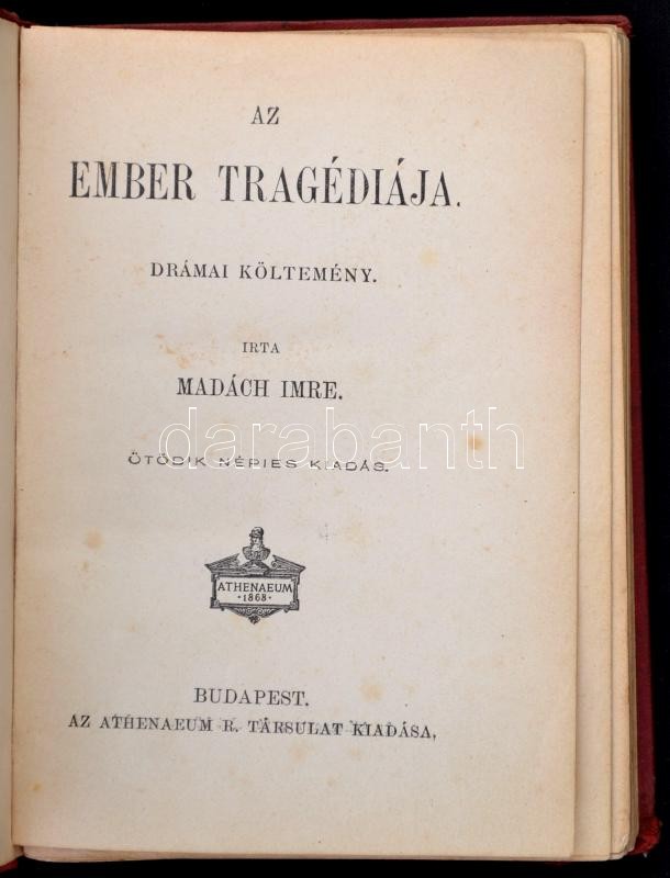 Madách Imre: Az ember tragédiája. Drámai költemény. Ötödik népies kiad... https://www.darabanth.com/de/309-Fernauktion/309.0/Bucher/Bucher-Andere-kuriositaten~500016/Madach-Imre-Az-ember-tragediaja-Dramai-koltemeny-Otodik-nepies-kiadas-Bp-en-Athe~II1684804