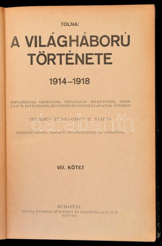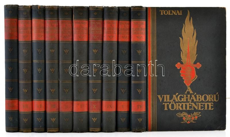 Tolnai A világháború története 1914-1918 I-X. Diplomáciai okiratok, hivatalos jelentések, szemtanuk hiteles följegyzései és eredeti adatok nyomán. Több szász képpel, eredeti felvételekkel, és térképekkel. Budapest, é.n. [1928-1931], Tolnai Nyomdai Műintézet és Kiadóvállat Rt. Teljesen átdolgozott, második kiadás. Kiadói aranyozott egészvászon kötés, kopottas, kissé foltos borítóval, a VII. kötet gerince és a VIII. kötése kissé sérült.