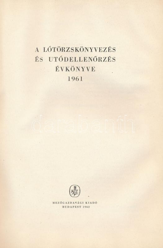 Babochay Sándor: A lótörzskönyvezés és utódellenőrzés évkönyve 1961. Bp., 1962, Mezőgazdasági Kiadó. Kiadói papírkötés, jó állapotban.
