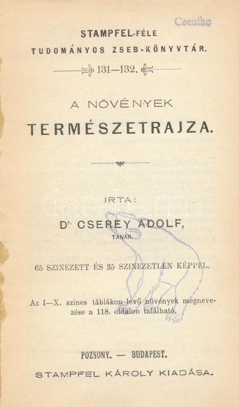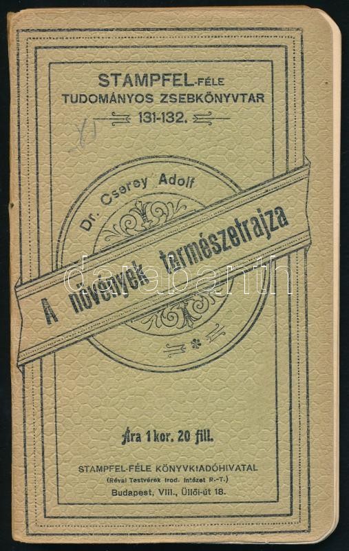Dr. Cserey Adolf: A növények természetrajza. Stampfel-féle Tudományos Zseb-könyvtár 131-132. Bp.-Pozsony, 1900, Stampfel, 131+5 p.+X t. Színes táblákkal. Kiadói papírkötés, megviselt állapotban, a könyvtest szétvált és elvált a borítótól.