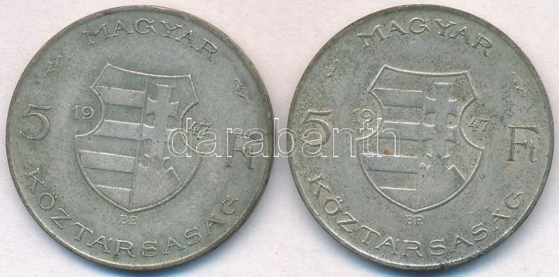 1947. 5Ft Ag "Kossuth" (2x) T:2,2- patina https://www.darabanth.com/de/309-Fernauktion/309.0/Numismatik/Ungarische-Munzen-und-Munzen-mit-ungarischem-Munzzeichen~400008/1947-5Ft-Ag-Kossuth-2x-T2-2-patina~II1685330