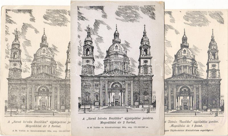 Beschreibung: 1947 3 db képeslap a Bazilika újjáépítésére