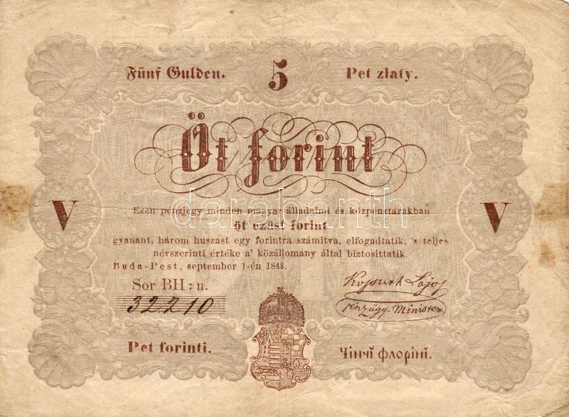 1848. 5Ft "barnás" + lemezhiba T:III/IV https://www.darabanth.com/de/31-Fernauktion/31.0/Numismatik/~222/1848-5Ft-barnas-plus-lemezhiba-TIIIIV~II59327