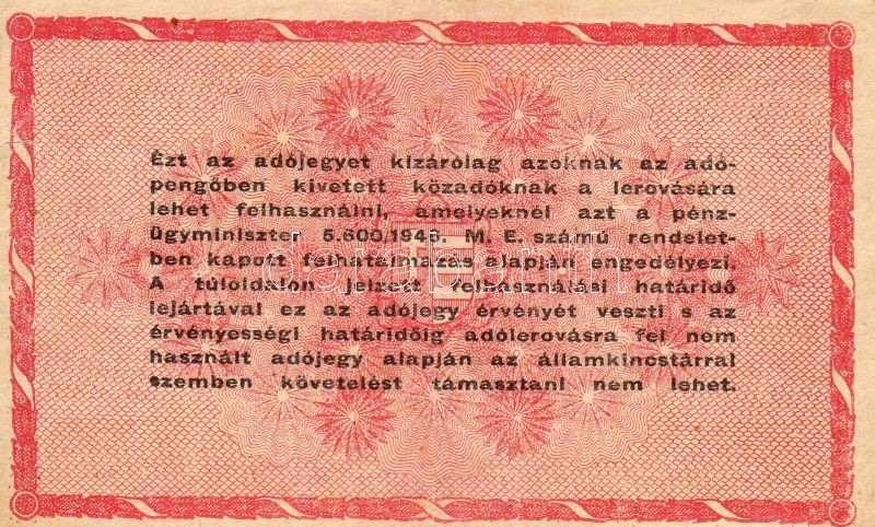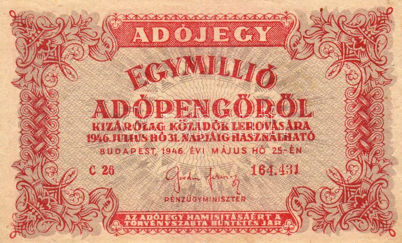 Beschreibung: 1946. 1000.000Adóp. f.sz. hatjegyű, címer fordított állású, vastag számok T:III/IV