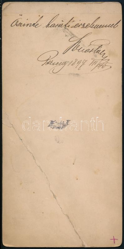 Beschreibung: 1897 Azonosítatlan férfi díszmagyarban, keményhátú fotó Wetschl Kázmér stomfai műterméből, hátulján feliratozva,törésnyommal, 20,5×10,5 cm