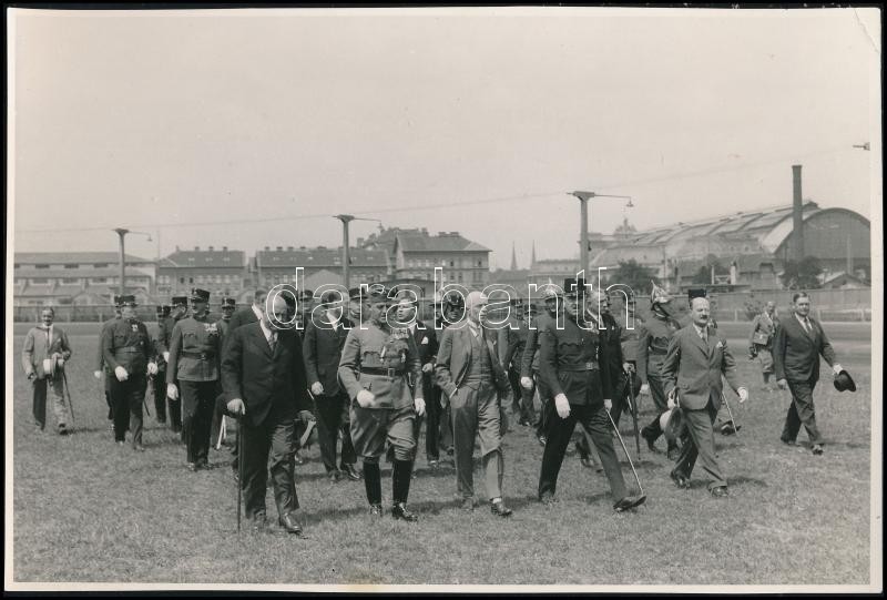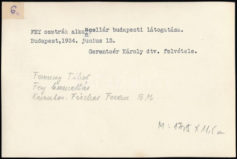 1934 Emil Fey (1886-1938) osztrák kancellár és belügyminiszter látogatása, kíséretében Keresztes-Fischer Ferenc belügyminiszter, Ferenczy Tibor rendőrfőkapitány és más rendőri vezetők, hátoldalon feliratozott fotó, egyik sarkán kis törésnyom, 11,5×17 cm