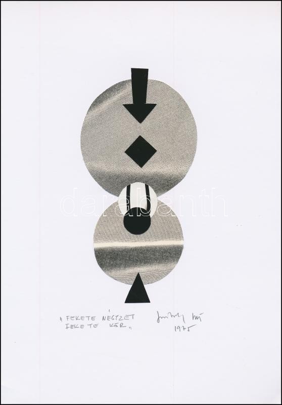 Beschreibung: 1975 Jankovszky György(1946-): Fekete négyzet, fekete kör, montázs, feliratozva, aláírt, pecséttel jelzett, 29,5×21 cm
