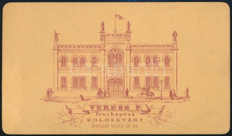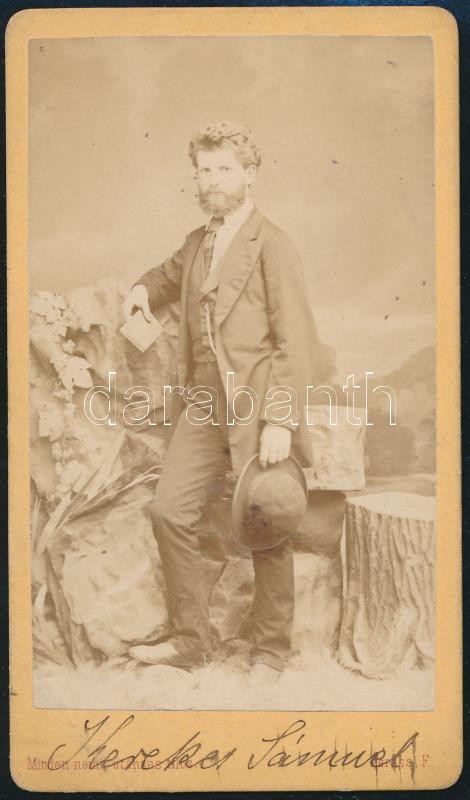 cca 1870 Kerekes Sámuel (1847-1895) tanár és író műtermi egész alakos portréja, Veress Ferenc (1832-1916) kolozsvári műterméből, hátoldalon a műterem képével, 10,5×6 cm