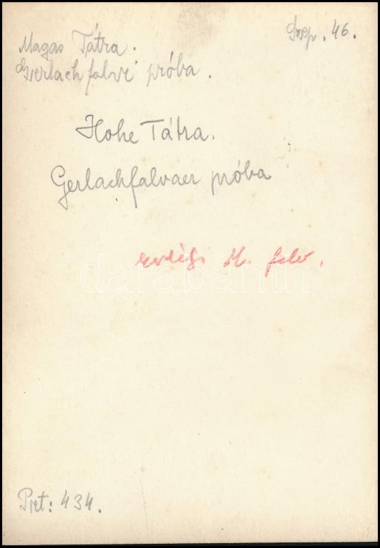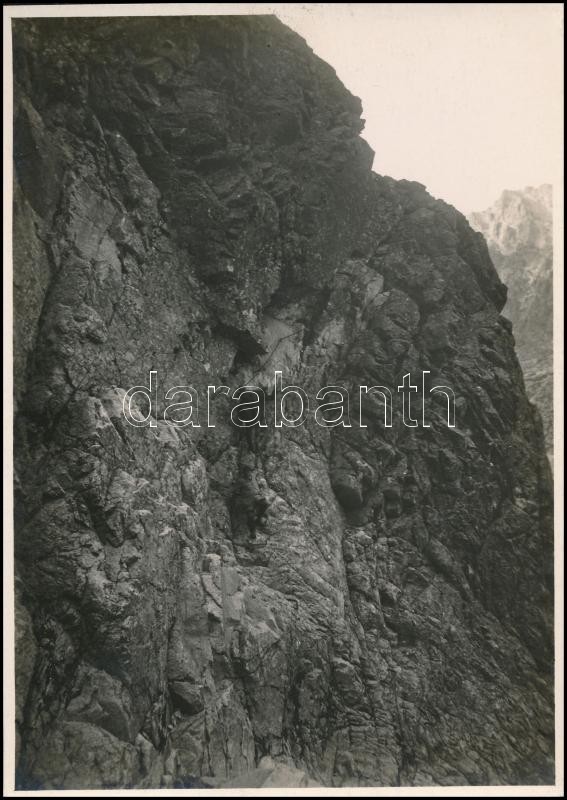 cca 1910 Magas-Tátra, hegymászók a Gerlachfalvi próbán, Erdélyi Mór felvétele, hátulján feliratozva, 11,5×16 cm / cca 1910 Vysoké Tatry, mountaineers at the Velická/Gerlachovská próba, with notes on its back, 11,5×16 cm