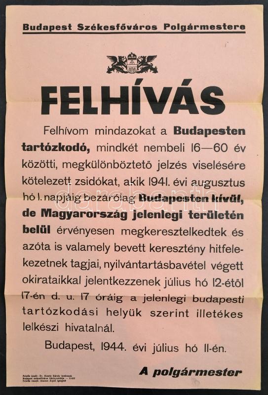 1944 Felhívás a budapesti, sárga csillag viselésére kötelezett, megker... https://www.darabanth.com/de/31-Gross-Auktion/31.1/Andere-Sammelgebiete/Judaica~12794/1944-Felhivas-a-budapesti-sarga-csillag-viselesere-kotelezett-megkeresztelkedett-zsidok-szC3~II1934889