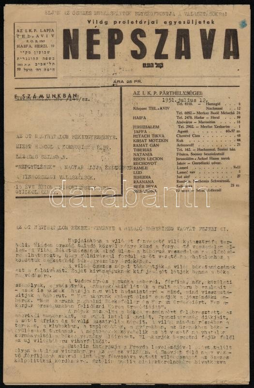 1951 Népszava, az Izraeli Kommunista Párt lapja, 4. évf. 28. lapszáma,... https://www.darabanth.com/de/31-Gross-Auktion/31.1/Andere-Sammelgebiete/Judaica~12794/1951-Nepszava-az-Izraeli-Kommunista-Part-lapja-4-evf-28-lapszama-erdekes-irasokkal-10-~II1944928