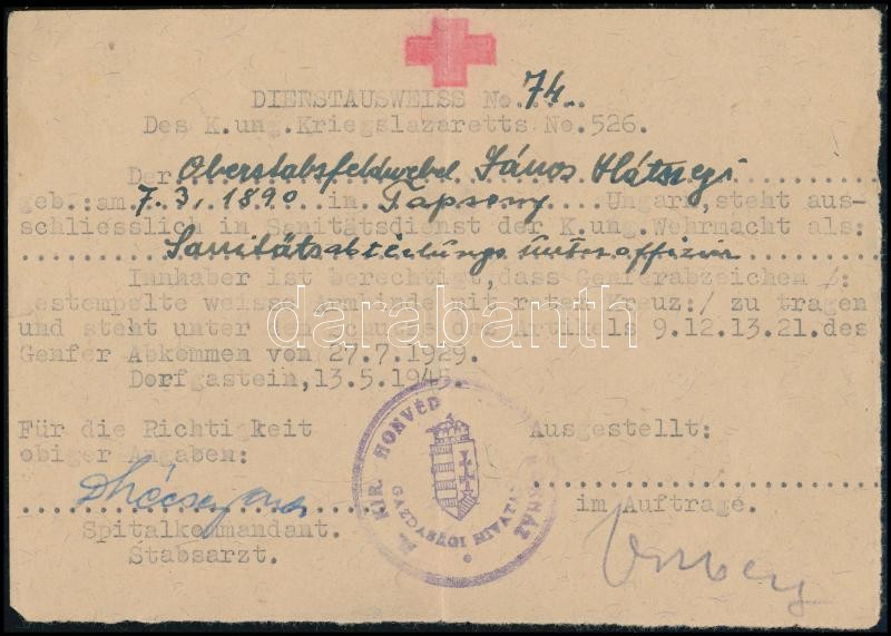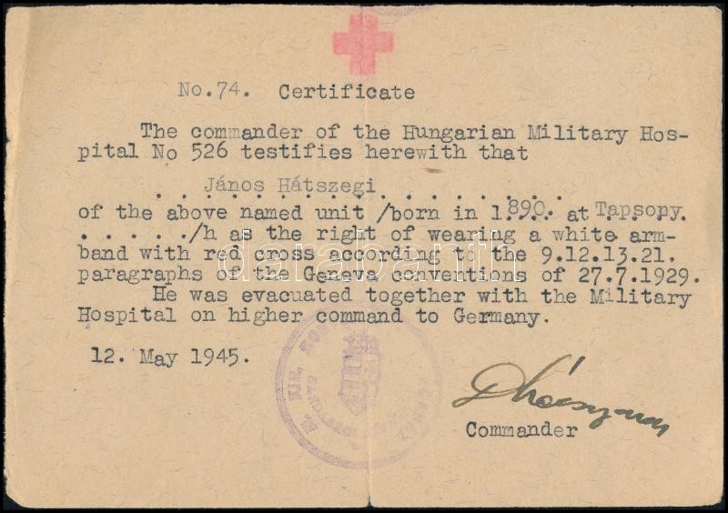 1945 Az 526. sz. katonakórház 2 db igazolása katonakórházi tisztviselő... https://www.darabanth.com/de/31-Gross-Auktion/31.1/Andere-Sammelgebiete/Militaria~13316/1945-Az-526-sz-katonakorhaz-2-db-igazolasa-katonakorhazi-tisztviselo-reszere-angol-illetv~II1944962