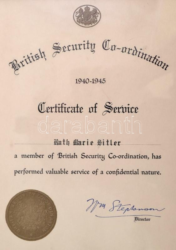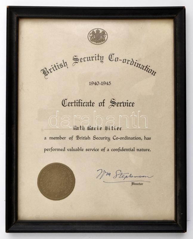 1945 Brit titkosszolgálat szolgálati emléklapja William Samuel Stephenson fedőnevén ,,Rettenthetetlen" igazgató aláírásával (1896-1989) / British Security Co-ordination Certificate of Service for a member with autograph signature of William Samuel Stephenson "Intrepid" in frame 20x25 cm