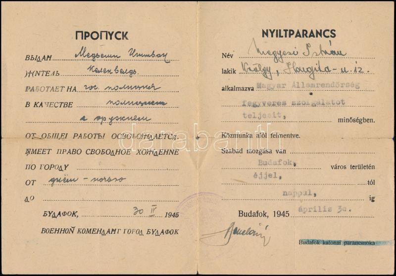 Beschreibung: 1945 Nyílt parancs fegyveres szolgálatot teljesítő rendőr részére, Budafok területén szabad mozgást biztosítva, orosz-magyar nyelven
