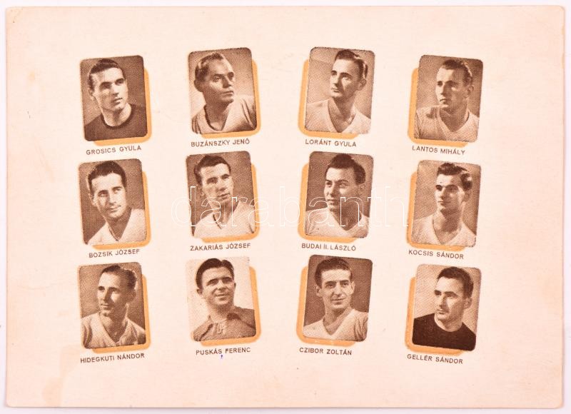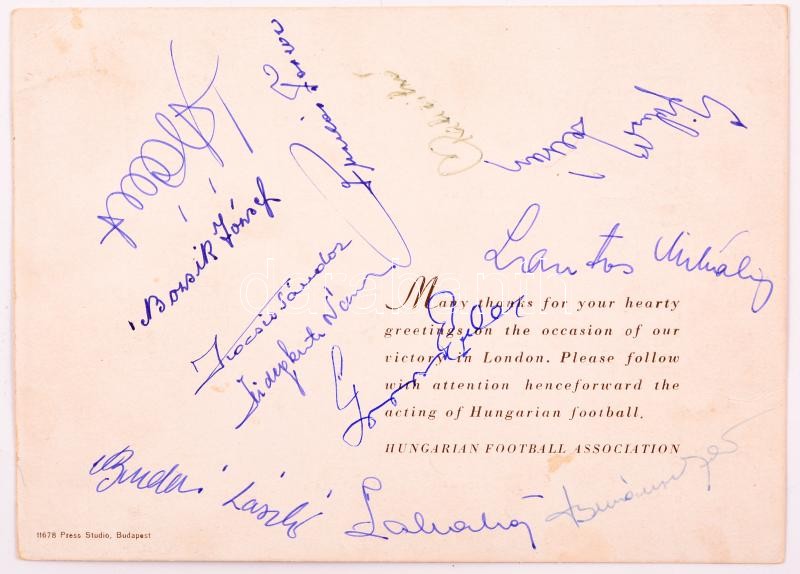 1953 A londoni 6:3-ra kiadott emléklap rajta az Aranycsapat tagjainak aláírásaival. Bozsik, Lantos, Budai, Puskás, Kocsis, Hidegkuti, Lóránt, Grosics, Zakariás, Czibor, Lóránt / Autograph signed commemorative card after the 6:3 match against England by the Hungarian football team. 15x11 cm
