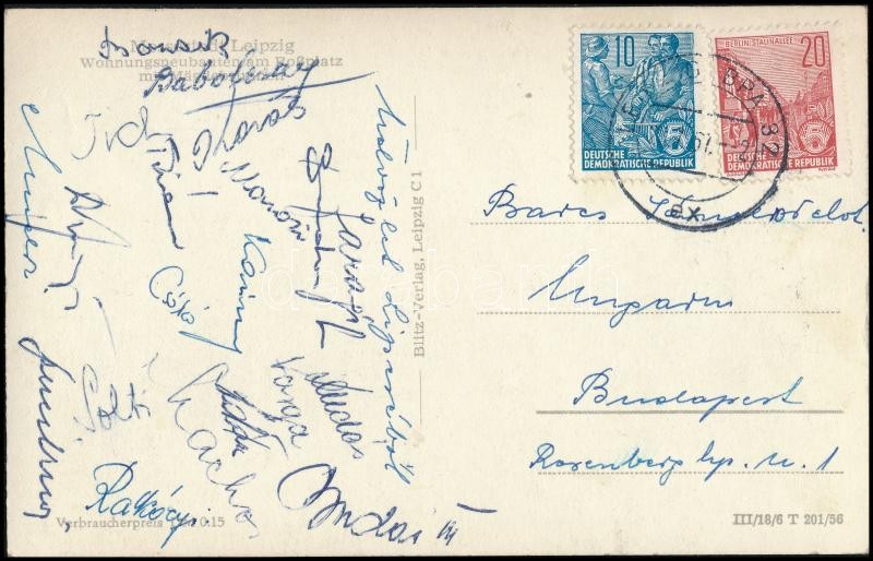 1957 Budapest Honvéd SE tagjai (Bozsik József, Babolcsay György, Machos Ferenc, Dudás Zoltán, Rákóczi László, Tichy Lajos, Budai László, Solti István..stb.) által Lipcséből küldött üdvözlő képeslap, saját kezű aláírásaikkal.