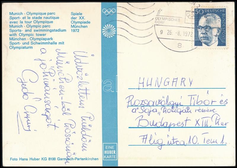 Beschreibung: 1972 Gedó György (1949- ) olimpiai bajnok ökölvívó üdvözlő sorai és aláírása a müncheni olimpiáról küldött levelezőlapon