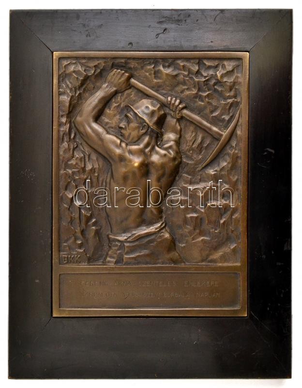 Beschreibung: 1935 Bóna Kovács Károly (1897-1970): Ferenc-Akna-Szentelés emlékére, Várpalota, bányász bronz plakett, fa keretben, jelzett, 20×14 cm