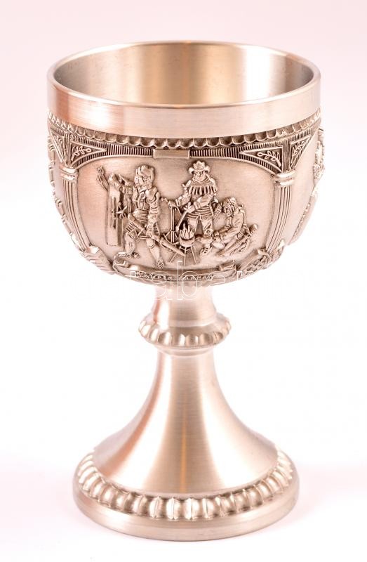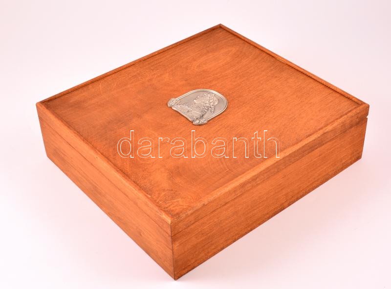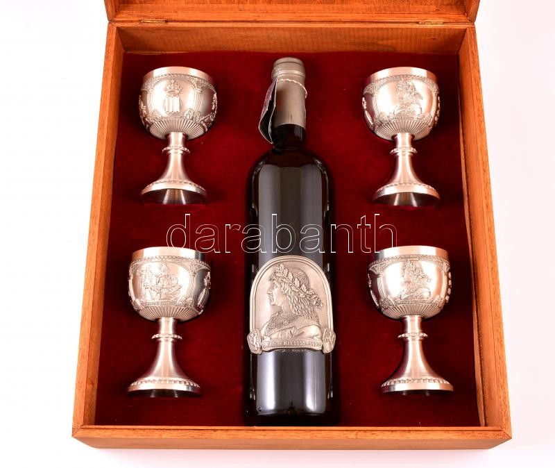 Mathias Rex Cabernet Sauvignon - Baksa pincészet 2000. Exclusiv vörösbor ón címkével, négy, jelenetekkel díszített ón kupával, eredeti fa díszdobozban. / Quality red wine with tin label and 4 tin chalice with ornaments in special case.