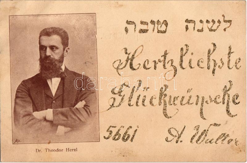 1900 Herzl Tivadar, a cionizmus megalapítója. Arthur Walter üdvözlőlapja héber nyelvű szöveggel / Dr. Theodor Herzl, father of modern political Zionism. Hebrew decorated text (fl)
