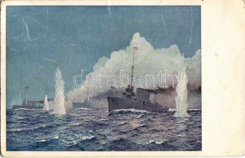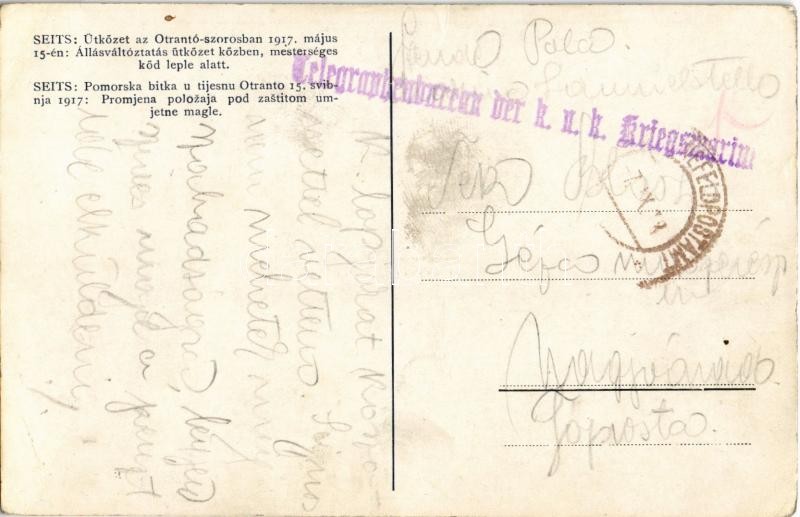 Ütközet az Otrantói-szorosban 1917. május 15-én: Állásváltoztatás ütközet közben, mesterséges köd leple alatt / WWI Austro-Hungarian Navy K.u.K. Kriegsmarine. The Battle of Otranto in 1917. Change of the battleship positions during combat, under artificial fog s: Seits (EK) + Telegraphenbureau der k.u.k. Kriegsmarine
