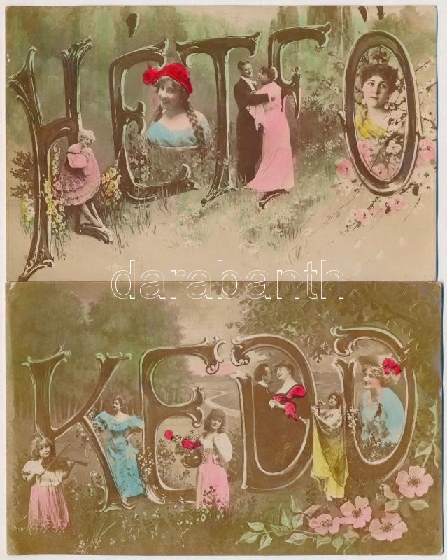 A hét napjai - 7 darabos teljes romantikus képeslapsorozat, jó állapotban 1906-ból / Days of the Week - complete, 7-part romantic postcard series in good condition from 1906. Oranotypie L.D.F.