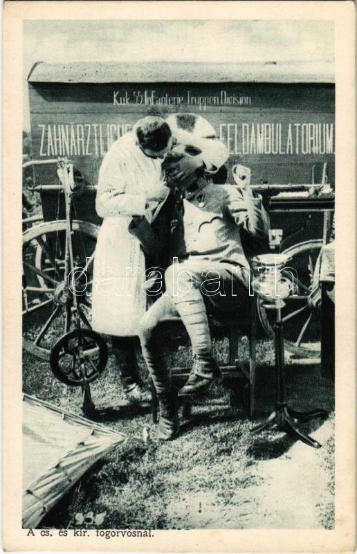 A császári és királyi fogorvosnál. Érdekes Újság kiadása / K.u.k. 55. Infanterie Truppen Division Zahnärtztliche Feldambulatorium / Austro-Hungarian military field dentist