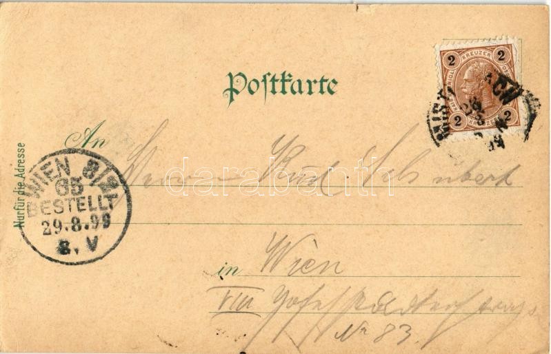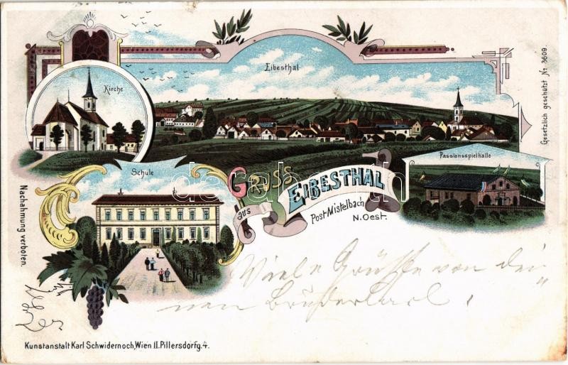 Beschreibung: 1899 (Vorläufer!) Eibesthal (Mistelbach), Passionsspielhalle, Schule, Kirche / school, church, Passion Play theater. Kunstanstalt Karl Schwidernoch floral, Art Nouveau, litho (small tears)