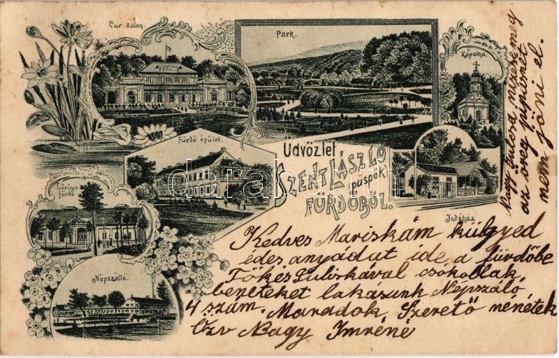 1904 Püspökfürdő, Szentlászlófürdő, Baile 1 Mai; fürdőépület, gyógyterem, Lőrincz fürdő, park, Népszálló, kápolna, indóház, vasútállomás / spas, park, hotel, chapel, railway station. Art Nouveau, floral