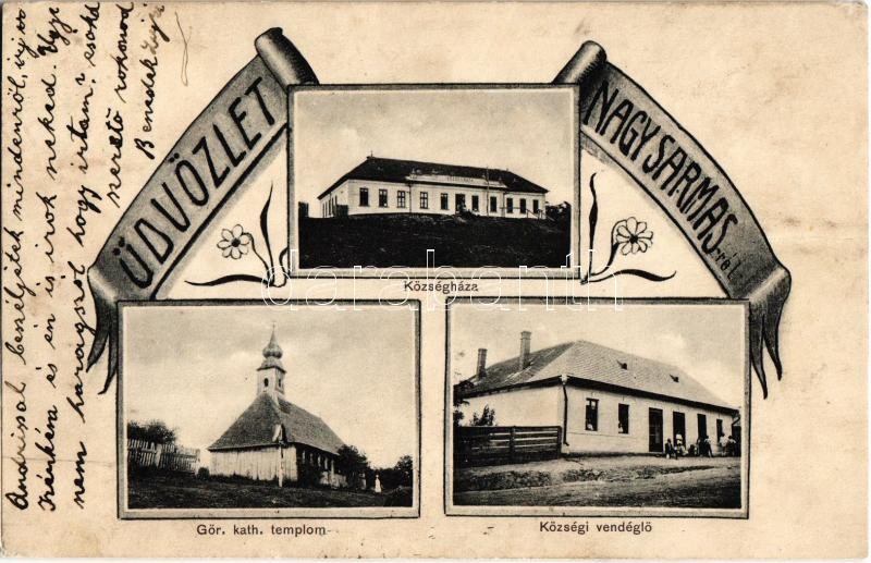 1911 Nagysármás, Sarmasu; községháza, görög katolikus templom, községi... https://www.darabanth.com/de/31-Gross-Auktion/31.1/Ansichtskarten/Siebenburgen~13126/1911-Nagysarmas-Sarmasu-kozseghaza-gorog-katolikus-templom-kozsegi-vendeglo-town-ha~II1937544