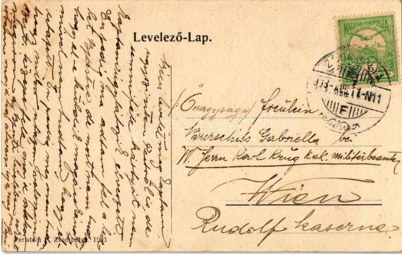 Beschreibung: Zsombolya, Jimbolia; Kossuth Lajos szobor, hazafias tulipános montázs díszítéssel. Kiadja Perlstein / Kossuth statue, monument, patriotic tulip montage