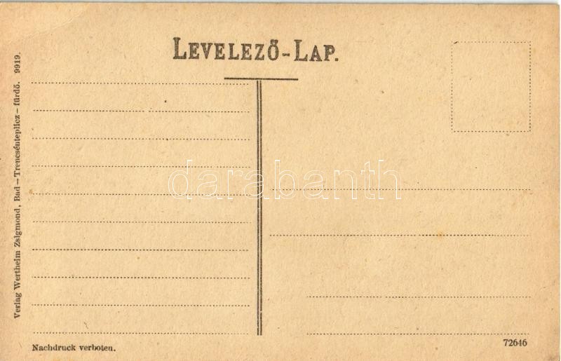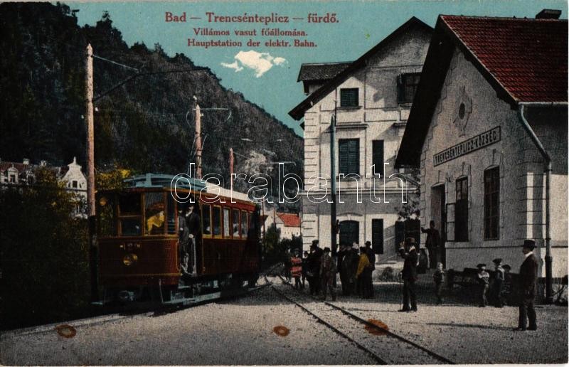 Trencsénteplic, Trencianske Teplice; Villamos vasút főállomása. Kiadja Wertheim Zsigmond / Hauptstation der elektrischen Bahn / tram station, tramways, railway station (EK)