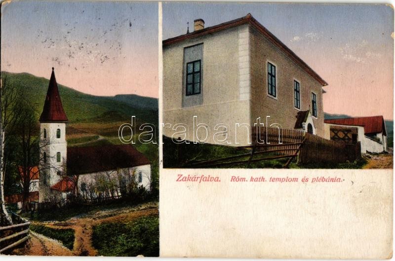 Beschreibung: Zakárfalva, Zakaróc, Zsakaróc, Zakarovce; Római katolikus templom és plébánia. Kiadja Korach Henrik / Catholic church and priory, parsonage (EK)