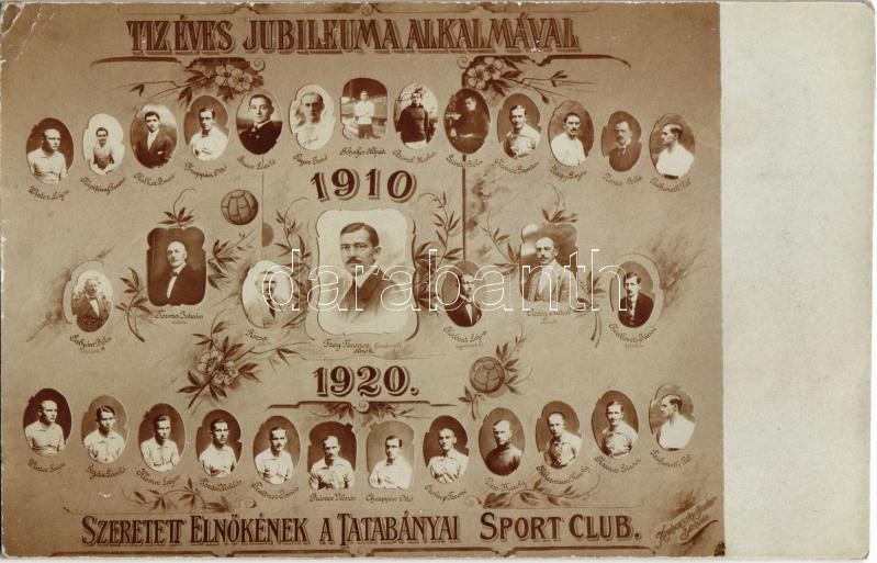 1910-1920 Tíz éves jubileuma alkalmával szeretett elnökének a Tatabányai Sport Club, tablókép a labdarúgókkal / Hungarian sport club's tableau photo with football players (EK)