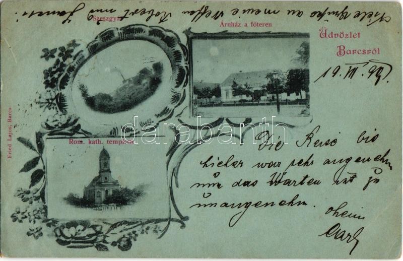 Beschreibung: 1899 Barcs, Római katolikus templom, szeszgyár, Fried Lajos áruháza a Fő téren és saját kiadása. Art Nouveau, floral (EK)