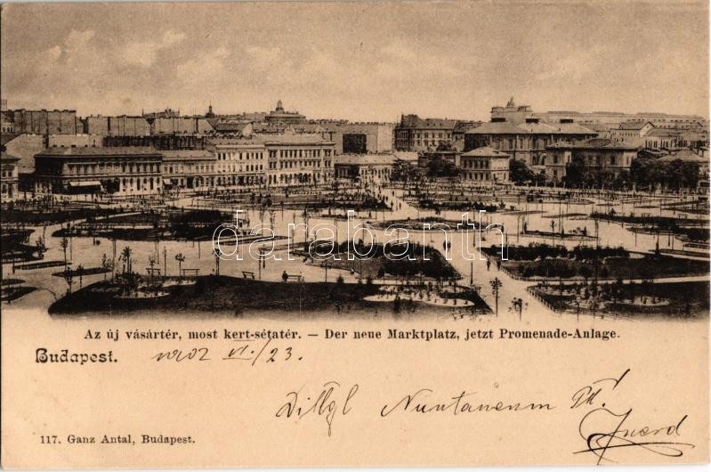 Beschreibung: 1902 Budapest VIII. Új vásártér, most kert-sétatér (ma II. János Pál pápa tér). Ganz Antal 117.