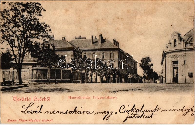 1903 Győr, Hunyadi utca, Frigyes laktanya. Kiadja Berecz Viktor (fl) https://www.darabanth.com/de/31-Gross-Auktion/31.1/Ansichtskarten/Ungarn~13125/1903-Gyor-Hunyadi-utca-Frigyes-laktanya-Kiadja-Berecz-Viktor-fl~II1947490