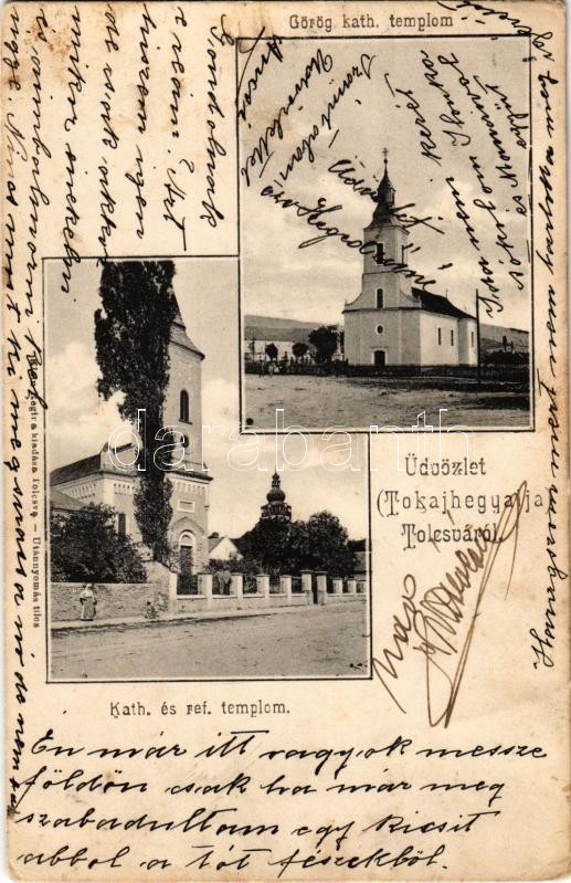 Beschreibung: 1908 Tolcsva (Tokajhegyalja), Katolikus, református és görög katolikus templom. Klein Regina kiadása