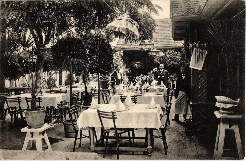 Beschreibung: 1913 Vác, Hotel Curia szálloda pálma és babér kerthelyisége, étterem, pincérek (EK)