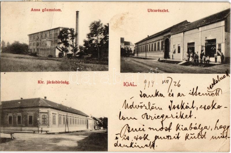 1914 Igal, Anna gőzmalom, utca, Járásbíróság, Enderle Jakab üzlete (fa... https://www.darabanth.com/de/31-Gross-Auktion/31.1/Ansichtskarten/Ungarn~13125/1914-Igal-Anna-gozmalom-utca-Jarasbirosag-Enderle-Jakab-uzlete-fa~II1938958