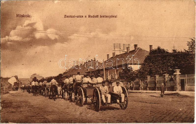 1914 Miskolc, Zsolcai utca a Rudolf laktanyával, katonák konvoja. Kiad... https://www.darabanth.com/de/31-Gross-Auktion/31.1/Ansichtskarten/Ungarn~13125/1914-Miskolc-Zsolcai-utca-a-Rudolf-laktanyaval-katonak-konvoja-Kiadja-Divald-Karoly-Fia-26-191~II1947507