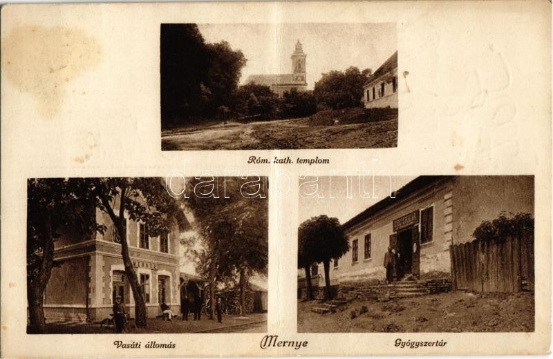 1933 Mernye, Római katolikus templom, gyógyszertár, vasútállomás, keré... https://www.darabanth.com/de/31-Gross-Auktion/31.1/Ansichtskarten/Ungarn~13125/1933-Mernye-Romai-katolikus-templom-gyogyszertar-vasutallomas-kerekparos~II1941693