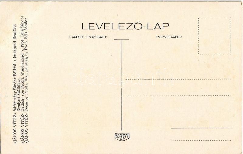 Budapest V. Egyetem utca 5. Erzsébet Királyné Szálló étterem és söröző pince, Sándor Béla falfestménye Petőfi Sándor János vitézéből - 12 db használatlan régi képeslap a teljes sorozat kiváló minőségben / 12 unused pre-1945 art postcards, the whole series in excellent condition