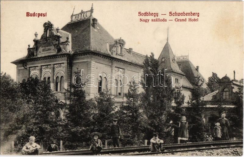 Beschreibung: Budapest XII. Svábhegy, Nagy szálloda, gyógyszertár, síneken ülő gyerekek. Hegedűs Dezső kiadása