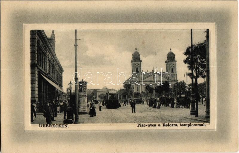 Beschreibung: Debrecen, Piac utca, Református templom, villamos, hirdetőoszlop, lovaskocsik. W.L. Bp. 5966.