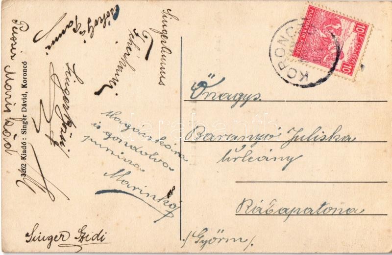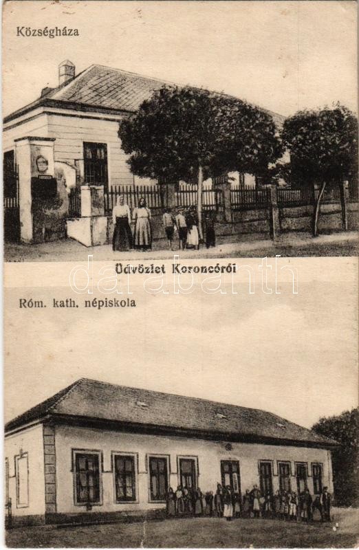 Beschreibung: Koroncó (Győr), Községháza, Római katolikus népiskola. Singer Dávid kiadása